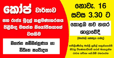 කෝප් වාර්තාව සහ රාජ්ය මුදල් කළමණාකරණය පිළිබඳ මහජන නියෝජිතයාගේ වගකීම මැයෙන් මාර්තු 12 ව්යාපාරය විසින් සංවිධානය කරනු ලබන මහජන සම්මන්ත්රණය සහ විවෘත සංවාදය අද (16) පස්වරු 3.30 ට කොළඹ නව නගර ශාලාවේදී පැවැත්වේ.